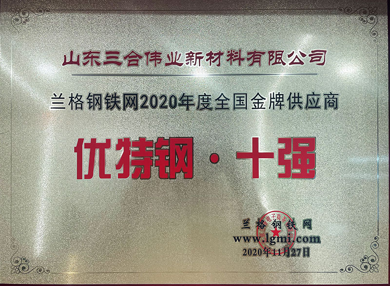 三合偉業獲評蘭格鋼鐵網2020年度全國金牌供應商